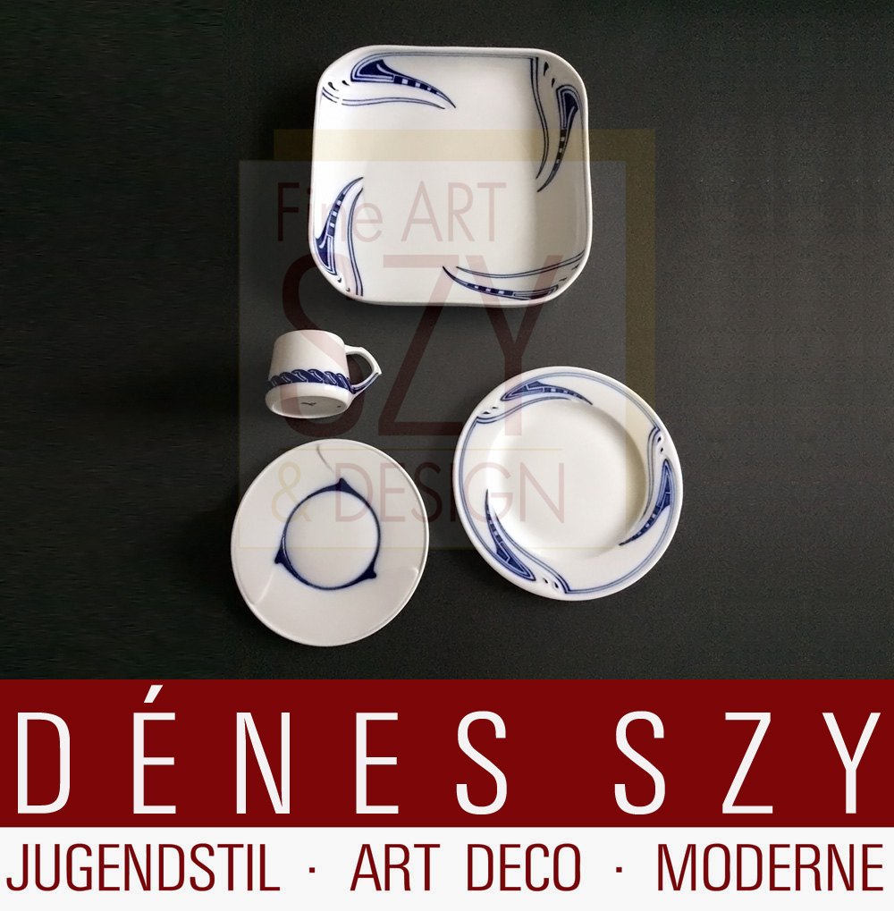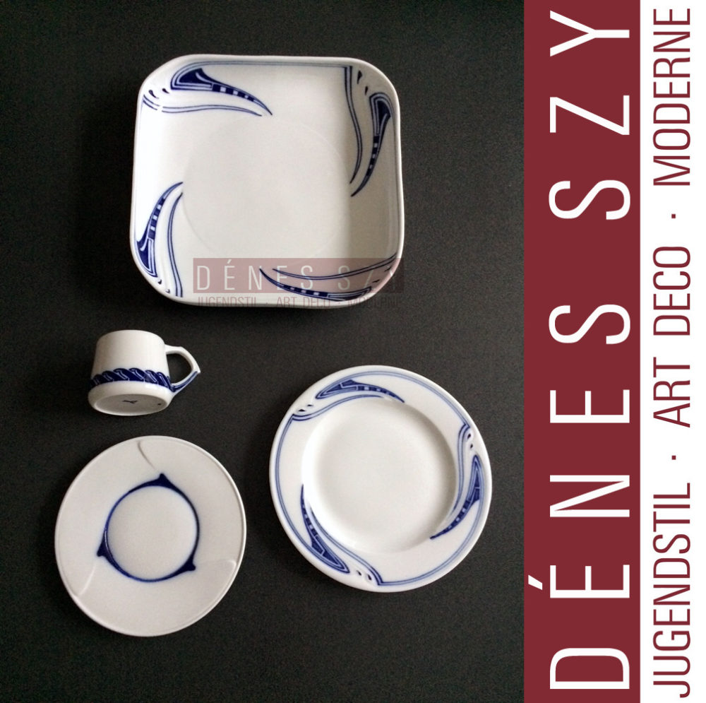 Porzellan, Porseleinen serviesonderdelen van Henry van de Velde (1863-1957), voor Meissener Porzellanmanufaktur, 1903-1904, Seite 78. Porzellan Sauciere, Brötchenteller, Eßteller, Muster Peitschenhieb in Kobalt Blau