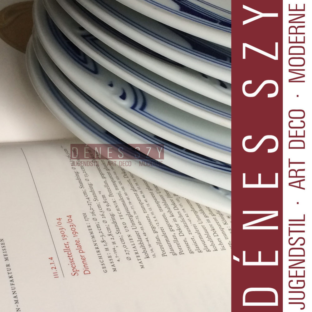 Literatur: Daenens, Lieven, Design museum Gent; History and collections (2007) Porseleinen serviesonderdelen van Henry van de Velde (1863-1957), voor Meissener Porzellanmanufaktur, 1903-1904, Seite 78. Sauciere, Brötchenteller, Eßteller in Kobalt Blau