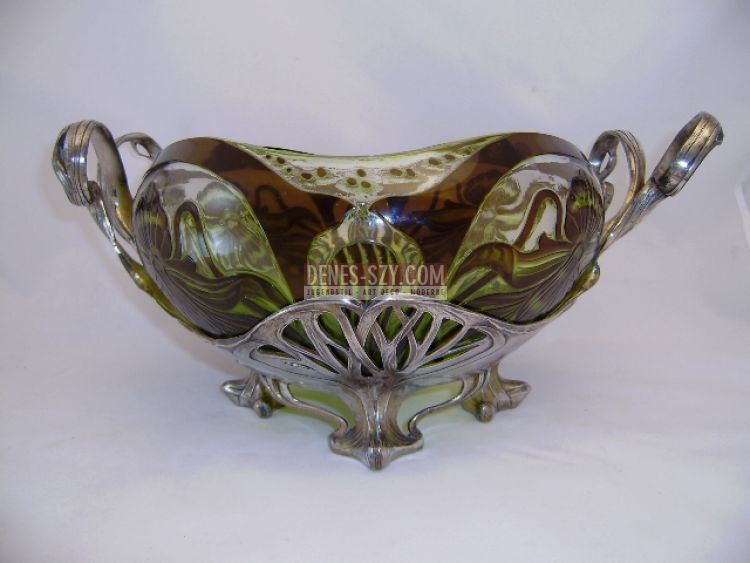 Die Jardiniere Modell Nr. 2551 gehört zu den aufwendig gestalteten Arbeiten der ORIVIT-Zinnproduktion um 1904 und steht exemplarisch für die Verbindung von Metall und künstlerisch ausgearbeitetem Glas.