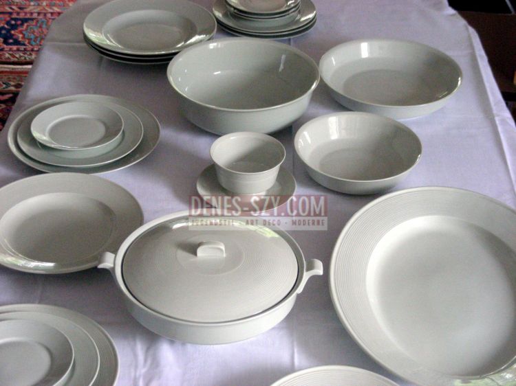servizio da tavola in porcellana verde pastello – seladon Design: Marguerite Friedlaender 1930/31 Esecuzione: manifattura Reale della porcellana di Berlino 1934, porcellana seladone, decoro con gole pressate marca: scretto blu, marca di Burg Giebichentein Letteratura: Broehan-Museum, Berliner Porzellan vom Jugendstil zum Funktionalismus 1889-1939, p. 198 condizione buona, prima scelta Stichwort: Weimar, Bauhaus, Friedländer, Prouve, René lalique, Edgar Brandt