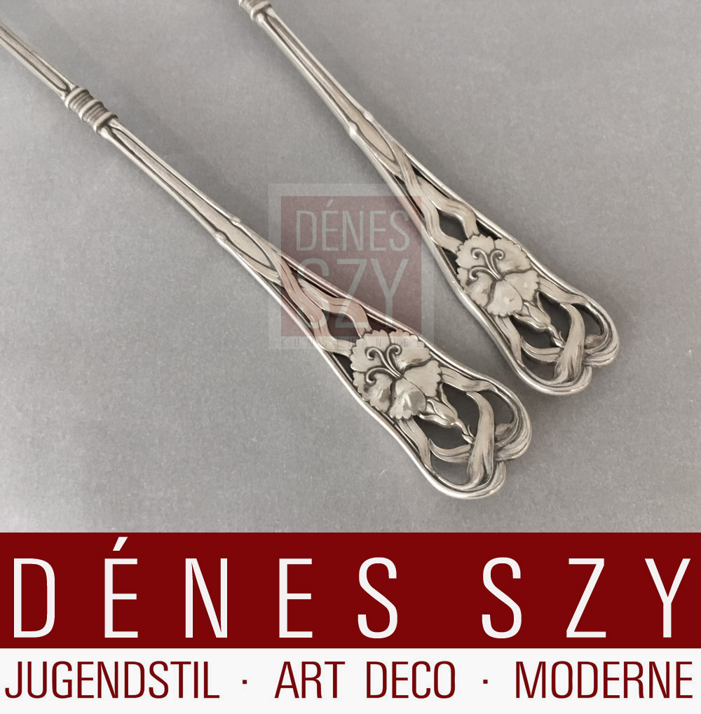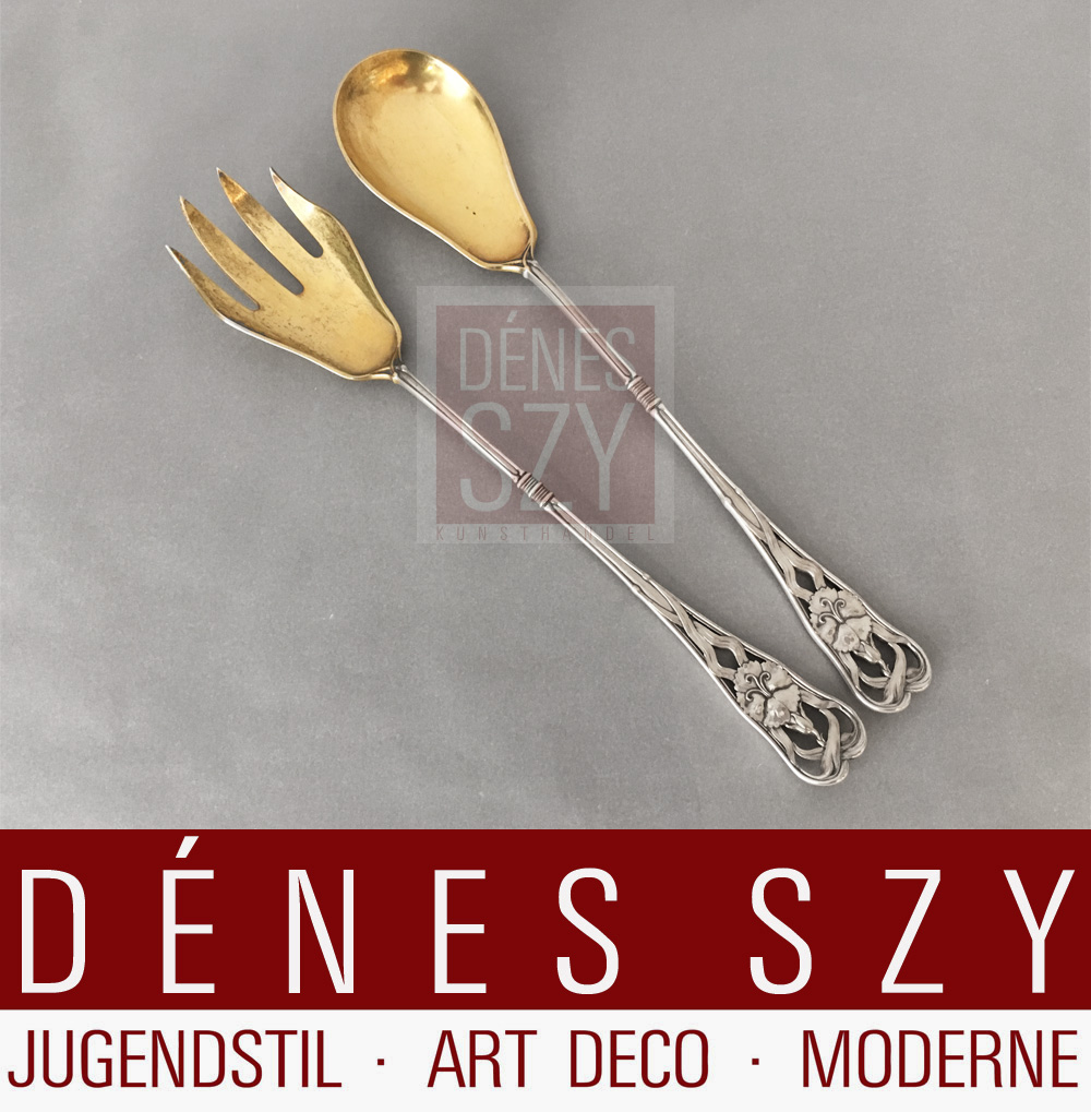 Posate da servire in argento di Wilkens con decorazioni floreali Coppia di posate da servire insalata con doratura parziale e decorazioni floreali Design: design di fabbrica Esecuzione: Wilkens e figli, Brema, inizio del XX secolo timbrato con marchio aziendale, mezzaluna, corona e 800 Argento 800 Lunghezza: 24,5 e 25 cm – 1 pollice (inch) = 2,54 centimetri – Condizioni: ottime condizioni originali, bella doratura