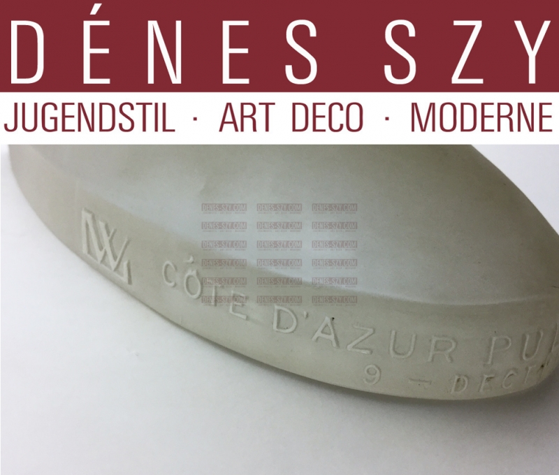 R. Lalique France Pullman Express Trophy glass statuette 1929, SCULPTURE – TROPHY – GIFT – PAPERWEIGHT – GLASS STATUETTE A René LALIQUE high quality French glass art work made for presentation to dignitaries, on the inagrual journay of the PULLMANN EXPRESS to the CÔTE D’AZUR 9th December 1929 FRANCE Signed: R.LALIQUE, PULLMANN EXPRESS 1929 Maße: Höhe 17 cm, Länge 13 cm, Tiefe ca. 5,7 cm — 1 Inch (Zoll) = 2,54 Zentimeter — only a few of wich have survived. Nearly 86 years on I am proud to offer this magnificent piece in mint condition It is understood that only 200 examples were ever made with the raised lettering on the foot Literatur: MARCILHAC S. 396 Rene Lalique for Pullman Express, a Cote d’Azure statue, frosted glass paperweight, designed circa 1929, modelled as a nude female figure, relief moulded commemorative lettering Cote D’Azure Pullman Express, 9 Decembre 1929, incised signature R Lalique, 16.5cm high Note: designed for passengers on the Paris Gare de Lyon to Ventimiglia Journey of the Cote D’Azur Pullman Express, Lalique was also responsible for much of the interior furnishing and design of the train René Lalique France, frosted glass, cristal Trophy, statuette, Passanger presentation gift for the inaugural journay of CÔTE D´AZUR – PULLMAN EXPRESS 1929, signed R. Lalique, 1/200. only 200 examples.!!