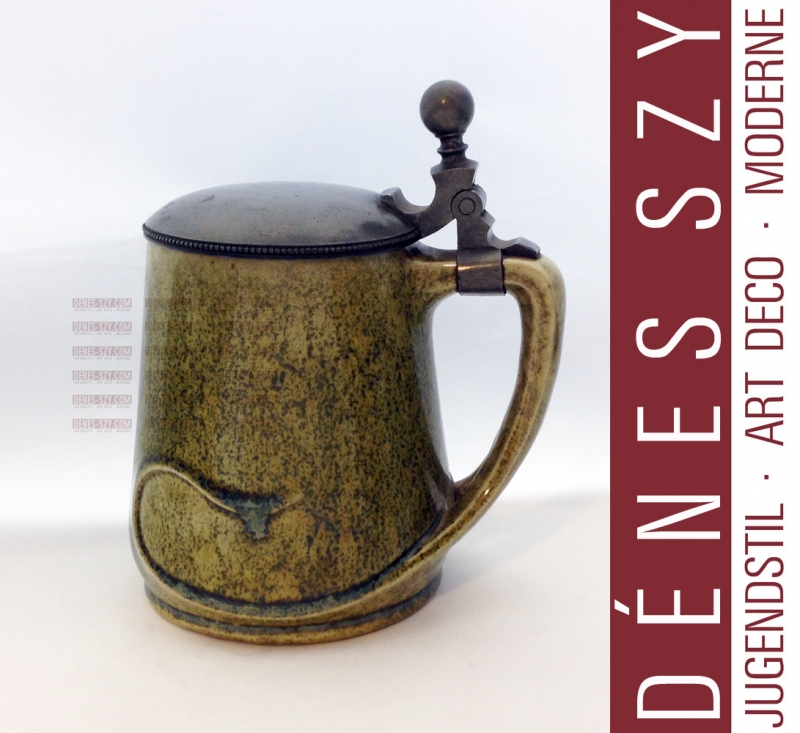 Richard Riemerschmid Art Nouveau stein Mettlach Germany Stein, Rare Art Nouveau STEIN # 2685 with pewter cover Design: Richard Riemerschmid for the WORLD EXHIBITION PARIS 1900 Execution: Villeroy and Boch, Mettlach ca. 1900/02 Measure: Height / Höhe insg. ca. 13,8 cm, Width / Breite ca. 11,8 cm, Durchmesser Fuß 9,2 cm — 1 Inch (Zoll) = 2,54 Zentimeter — Zustand: very good condition, rare colour Villeroy and Boch, German Art Nouveau Stoneware, stein with pewter mount, Design Richard Riemerschmid 1900, Mettlach Germany 1902.