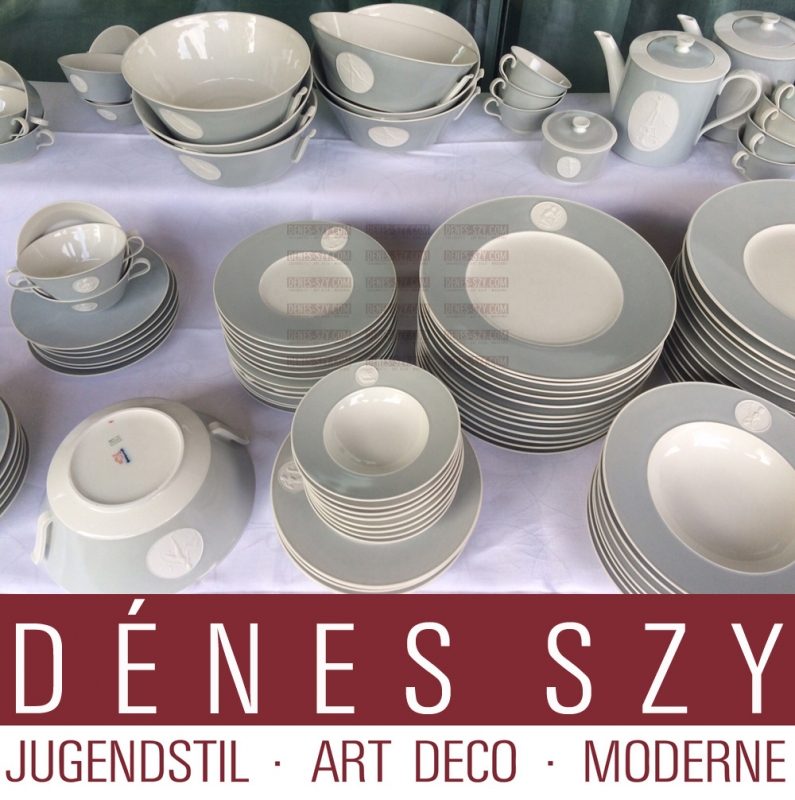 KPM Berlin porcelain service Arkadia in gray for 6 persons, porcelain service for 6 persons. Porcelain, decor ‘Arkadia’ in GRAY, design: Trude Petri with medallions by Siegmund Schütz 1938.