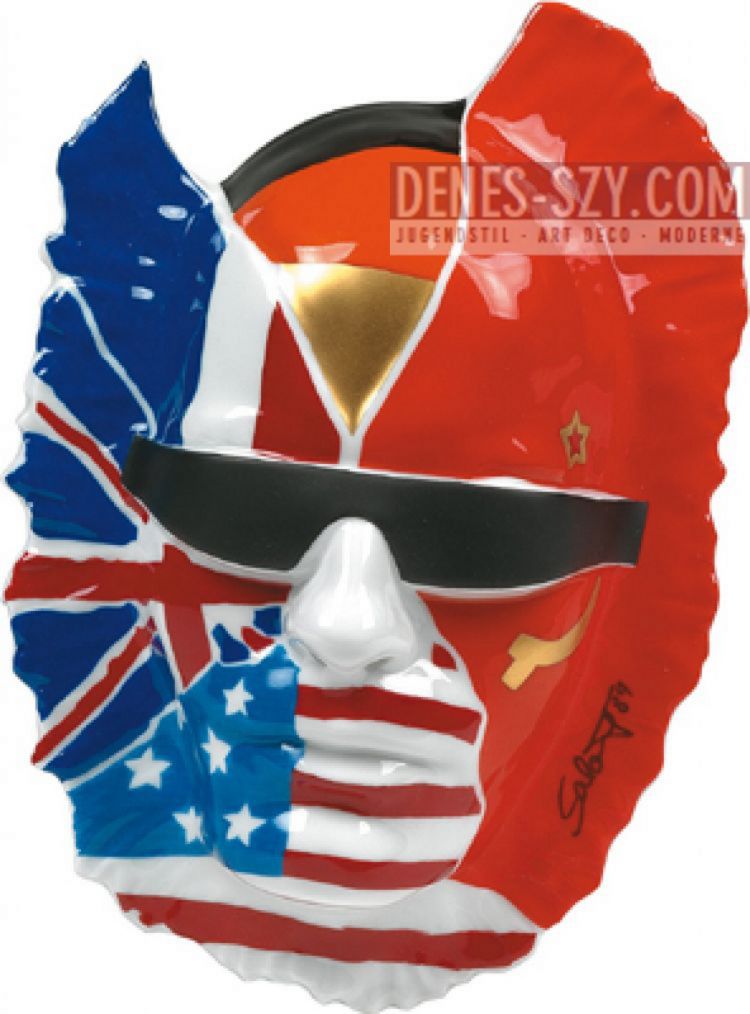 Mask, ROSENTHAL ANNUAL OBJECT Draft: Salomé (Wolfgng Cihlarz, born 1954) Title »Berlin Mask« (244/500 copies) Mask object 29 x 19 cm (1989) At the end of the sixties and the beginning of the seventies of the twentieth century, Berlin was the place where a new art emerged. Against the international dominance of pop art in its exact advertising aesthetics, the soon-to-be-named “Neue Wilde” painters and sculptors set a new spooky-expressive language that owes much to Berlin as a place. In this mask, Salomé creates his self-portrait as an artist in the divided city. The mask is almost shared by the flags of the Allies in the same proportions as the division of sectors actually exists. The German flag is wedge-like over the forehead. A hypermodern pair of glasses clasps the two halves of Berlin. Salomé points to the special feature of Berlin with this mask. The artificial cityscape becomes the ideal city of artists. Condition: very good, very decorative