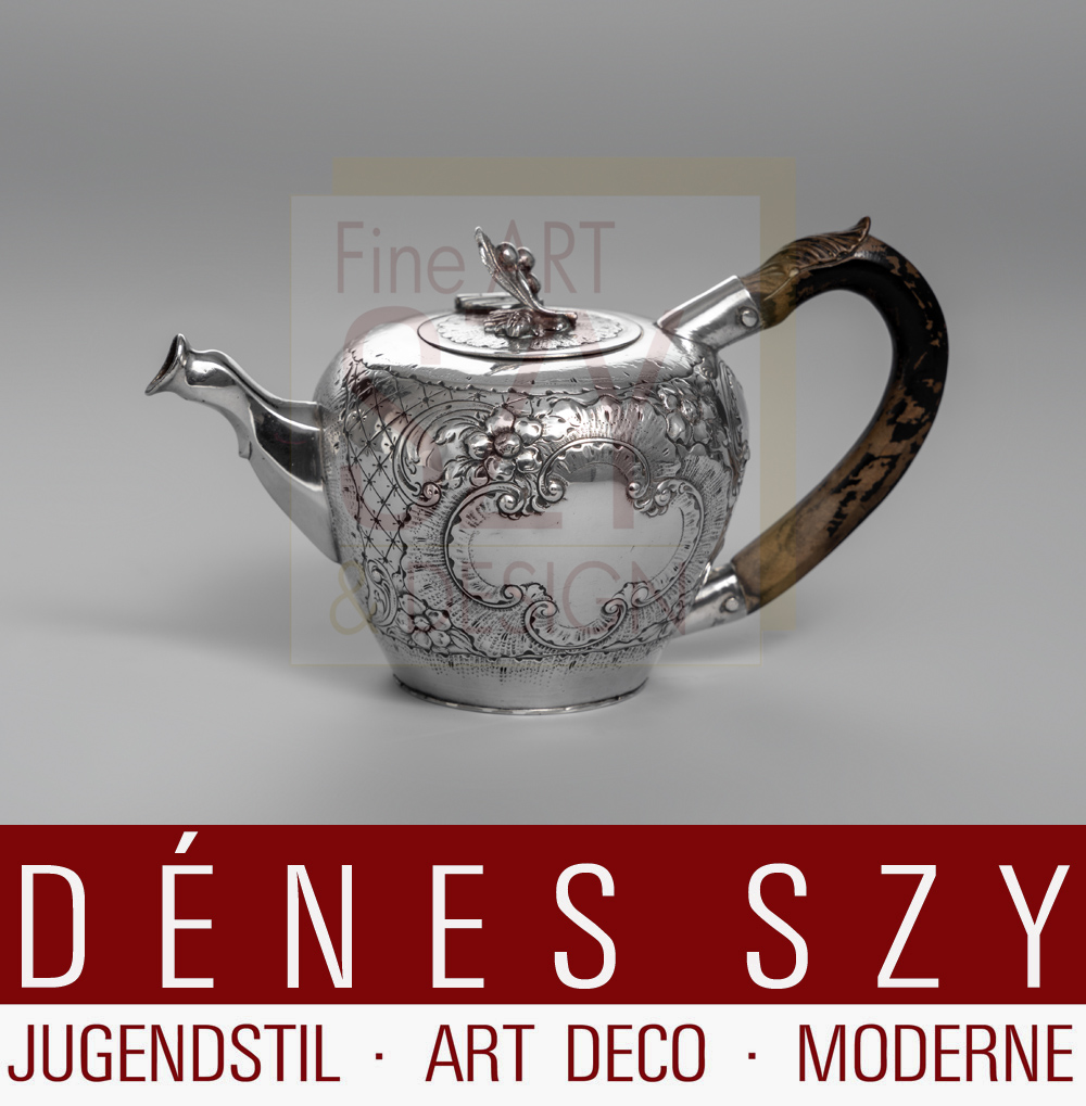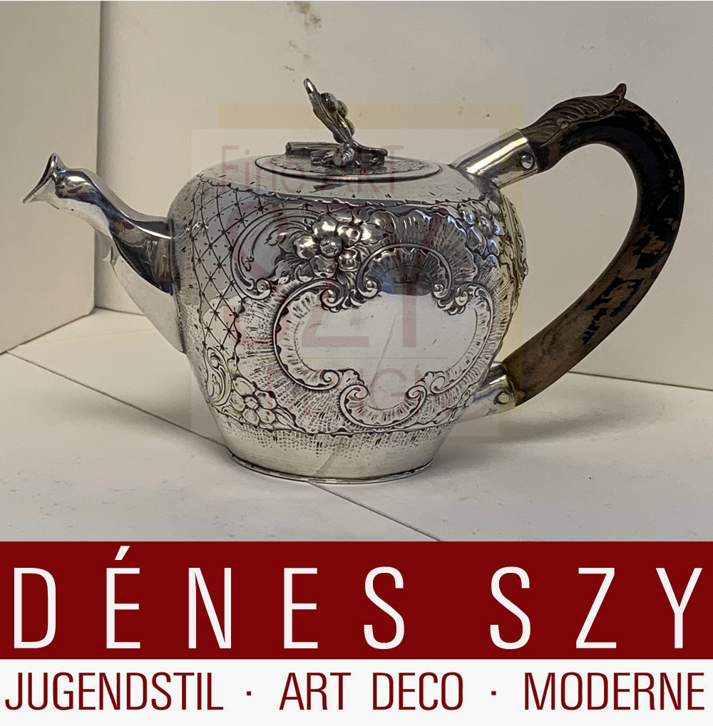 Barock Silber Teekanne, Meister: Johann Christoph Engelbrecht, Beschauzeichen: Augsburg 1763-1765, Silber 13 Loth (?), Henkel aus geschnitztem Holz