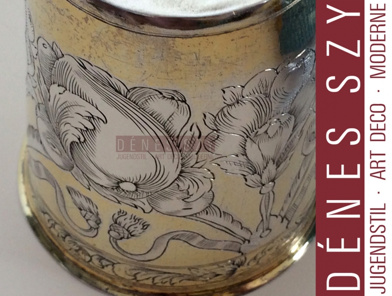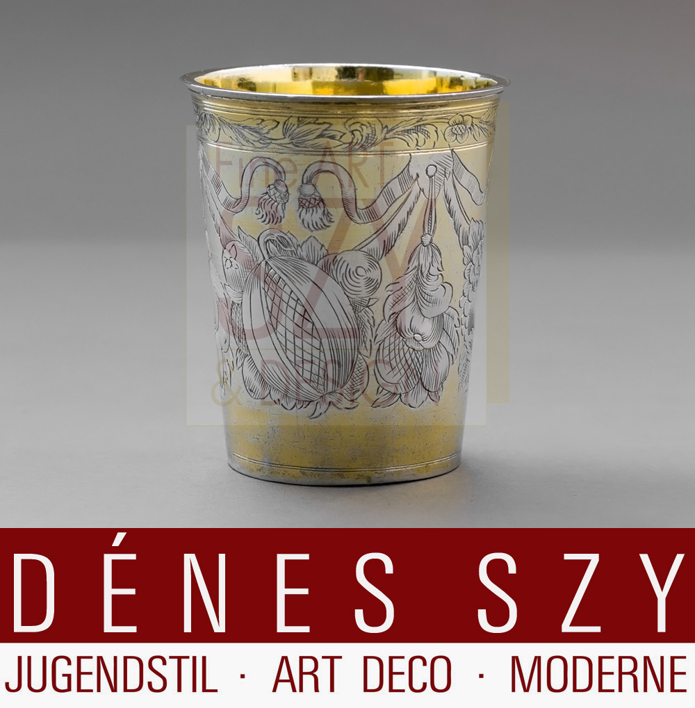 typische Arbeit des Mesiters LR, Silberbecher mit leicht konischer Form, profiliertem Lippenrand und gravierten Fruchtfestons an der Wandung, teilweise verfoldet, dem russischen Markt zugeführt.