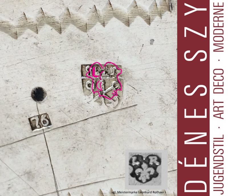 Meisterzeichen überpunzt mit Stadtmarke St. Petersburg 1735, darunter MZ von Leonhard Rothaer I (Scheffler No. 214): Meister seit 1671, Ältermann seit 1688, gestorben 1698