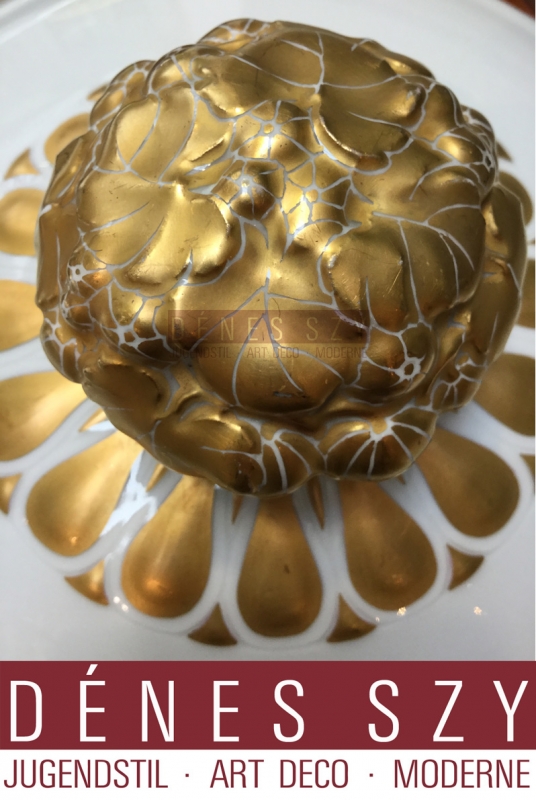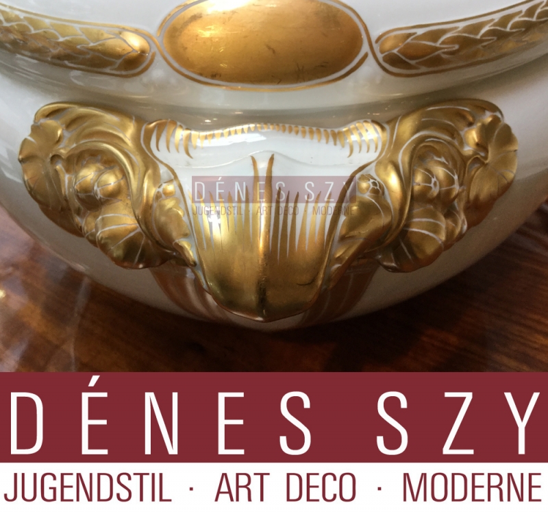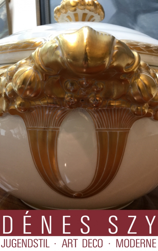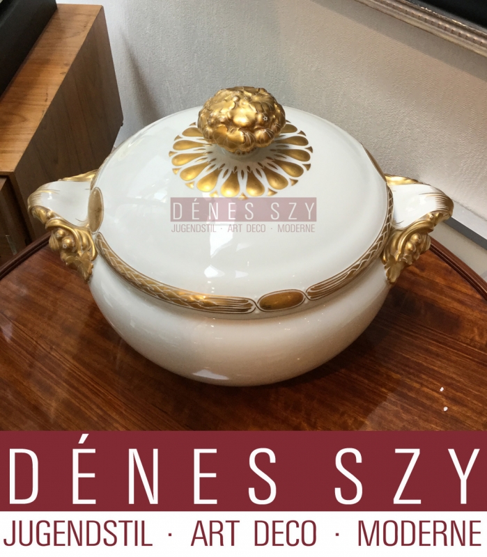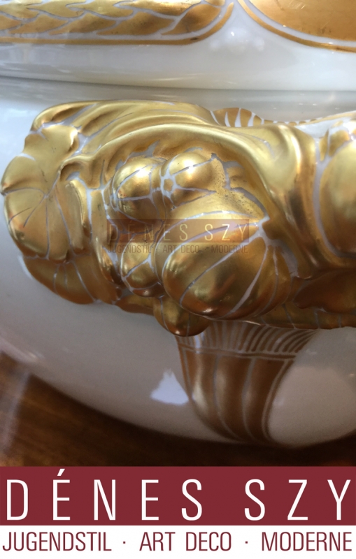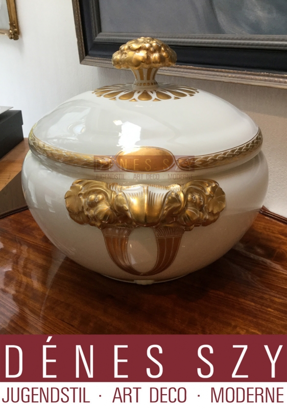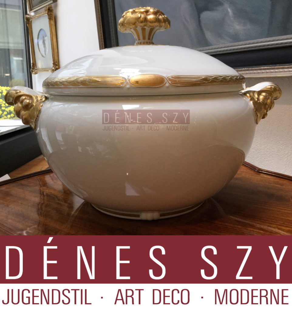 TERRINA | ZUPPIERA – CENTERPIECE JUGENDSTIL ART DECO SECESSIONIST AETHETIC MOVEMENT porcellana tedesca in stile liberty disegno: Theodor H. Schmuz-Baudiss 1912 circa dimensioni: altezza con coperchio 27,5 cm, larghezza 39 cm, diametro 24,2 cm — 1 Inch (Zoll) = 2,54 Zentimeter — collezione CERES Ceres Porzellan esecuzione: manifattura reale delle porcellane di Berlino, KPM Berlin 1914-18 marcata con scretto cobalto blu sottosmalto, TSB verde, croce di ferro