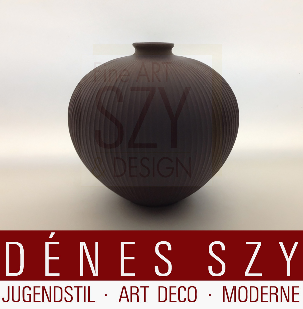 piccolo vaso a forma sferica, decoro scanalato spherical vase basalt china disegno: Trude Petri 1937 esecuzione: manifattura reale delle porcellane di Berlino, KPM Berlin marcata con scretto cobalto blu altezza 10,2 cm, diametro ca. 11 cm condizione molto buona, oggetto raro