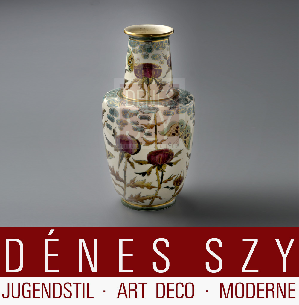 vaso da terra in stile liberty decorata con cardi e farfalle, ceramica invetriato Disegno ed esecuzione: Vilmos Zsolnay, Pécs – Ungheria 1878-1900, marca della manifattura Zsolnay nel blu, TJM (Teréz, Júlia és Miklós) altezza xx cm Lettteratura: Zsolnay Ungarische Jugendstilkeramik; MAK Wien 1986 condizione perfetta