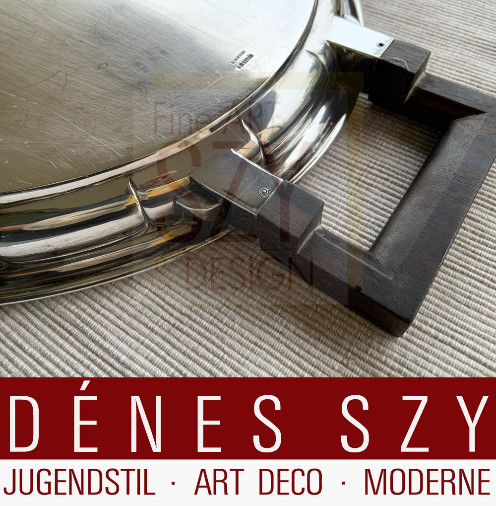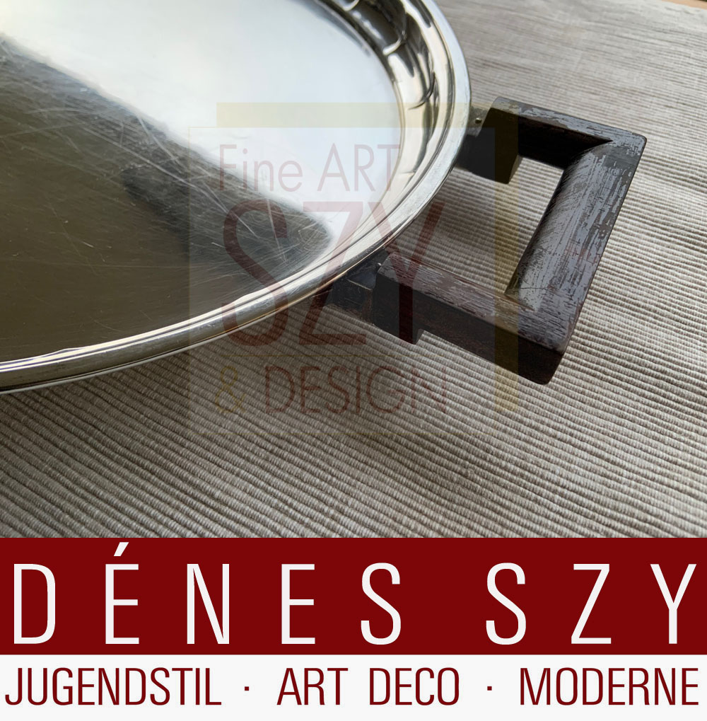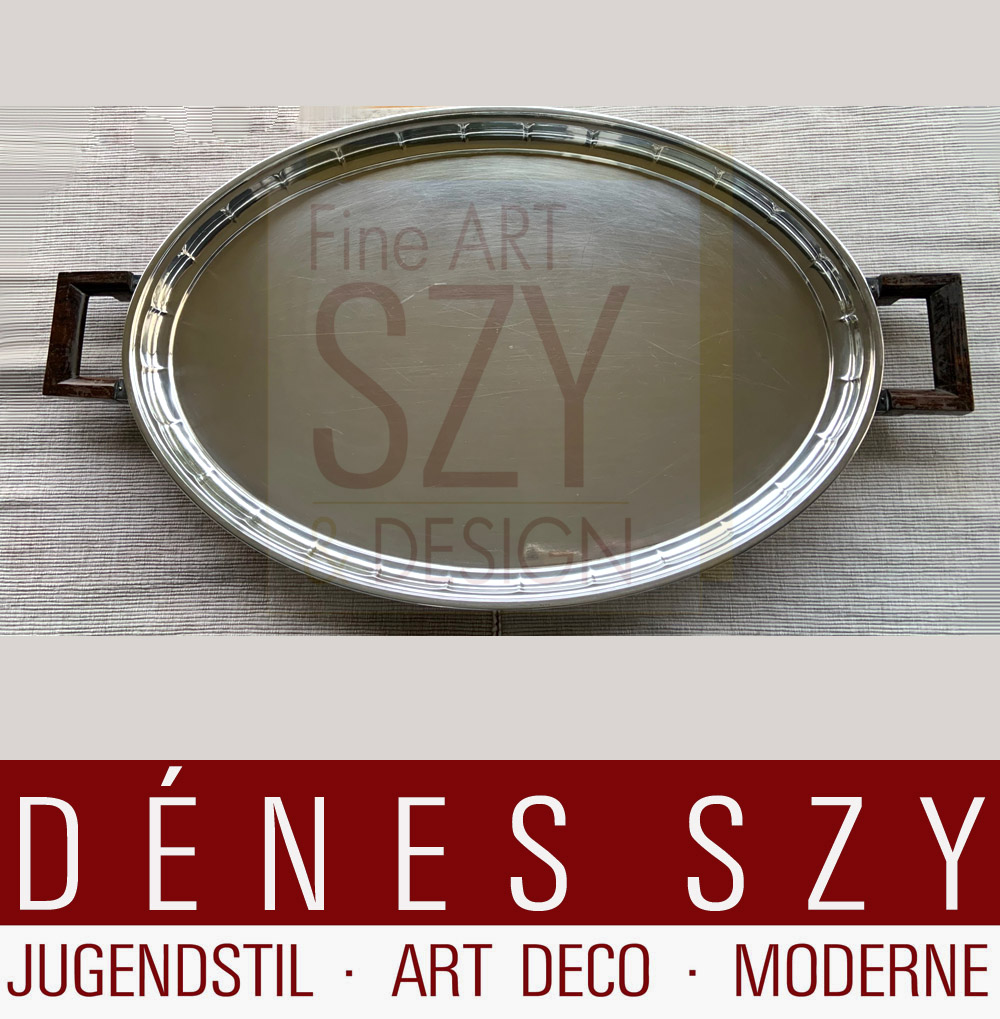 Großes ovales Art Deco Bauhaus Silber Tablett mit Holzhenkeln
